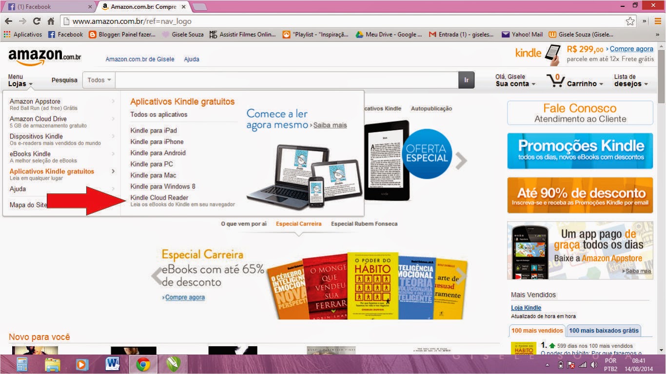 É só você ir lá no APLICATIVOS KINDLE GRATUITOS e selecionar o KINDLE CLOUD READER