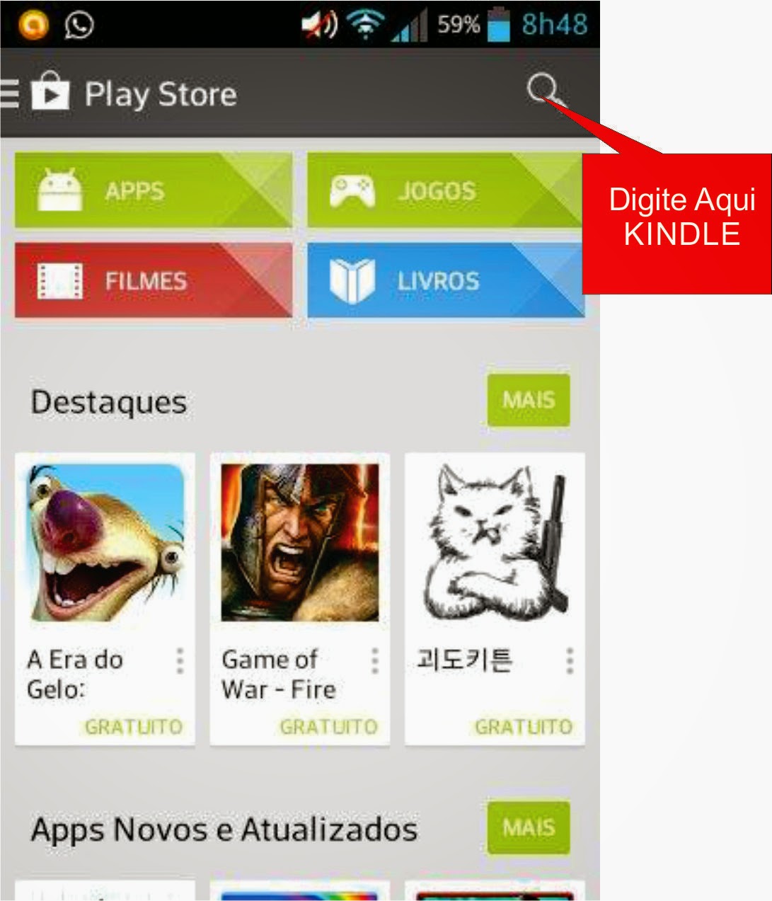Entre no PLAYSTORE onde você baixa os aplicativos, e procure pelo App KINDLE depois de encontrá-lo é só clicar em cima e instalar no seu aparelho.