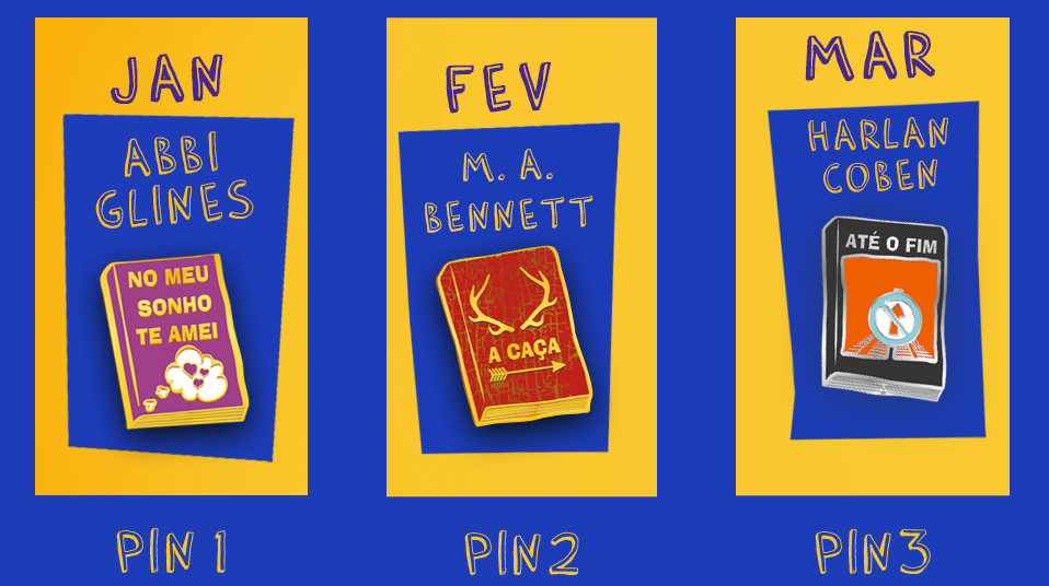 Durante o ano de 2019, a Editora Arqueiro vai dar a seus leitores um pin por mês. Será selecionado um livro por mês para ser acompanhado de um pin exclusivo para você colecionar! Mas, atenção, porque a promoção será válida somente para as compras feitas durante a pré-venda.